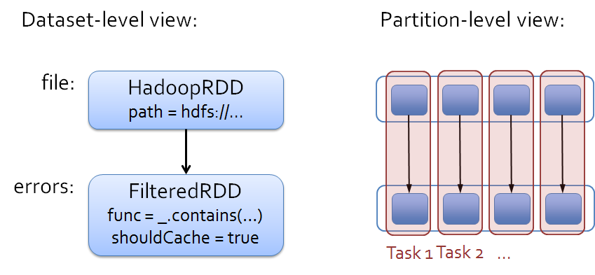 不管什么样的静态模型,其在动态运行的时候无外乎由进程,线程组成。由Spark的术语来说,static view成为dataset view,而dynamic view称为partition view。关系如图所示: